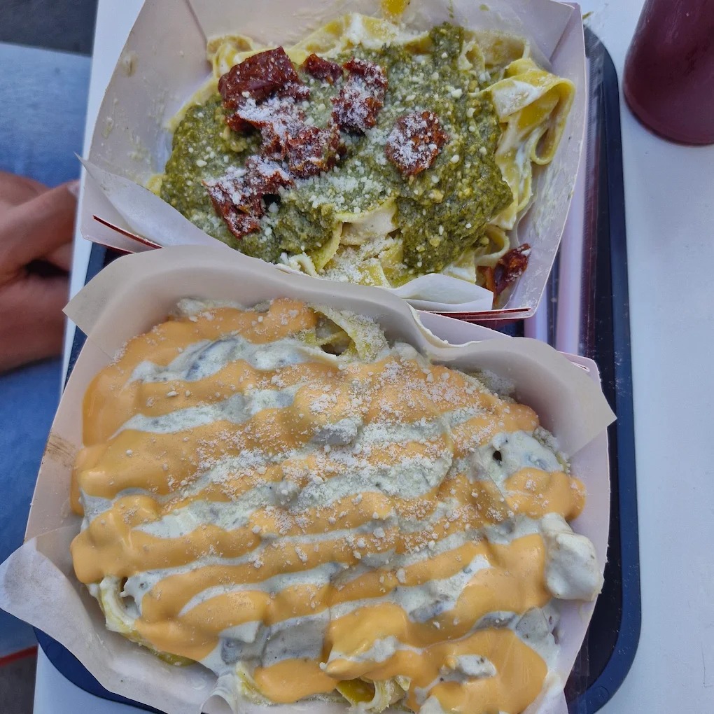 The menu focuses on Italian-inspired pasta dishes featuring creamy, tomato-based, and specialty sauces. Ingredients such as mushrooms, chicken, shrimp, vegetables, and Parmesan cheese are commonly used. The emphasis on freshly prepared pasta and rich sauces makes it a popular quick-meal option.