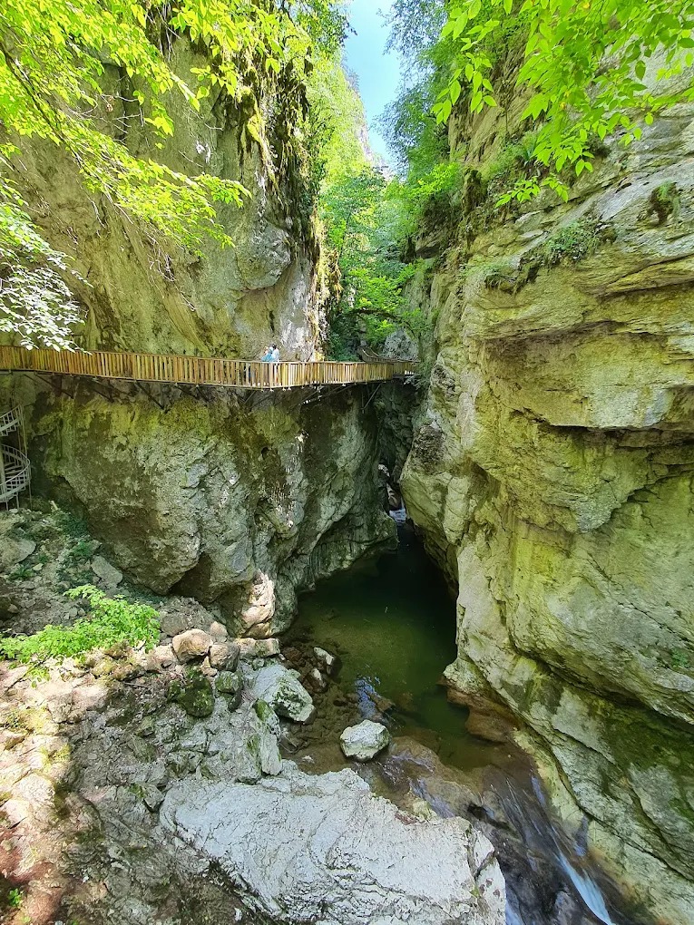 The height of the canyon reaches 200 meters in places. The walking trail is mostly located at a height of about 50-60 meters above the bottom. You do not hike at the bottom of the canyon. Special trekking groups can hike through the canyon at the bottom, but if you are not with a group and do not have a canyon guide, do not attempt such an adventure on your own.