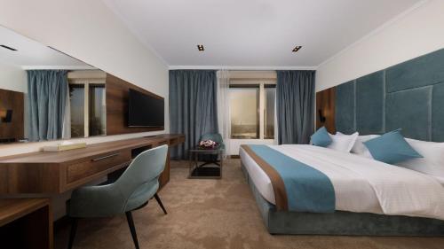 The rooms have air conditioning and a bathroom. Extra beds are available for a fee. In addition, there is a minibar and a work desk. Tea-coffee maker is also standard.included in the hardware. An ironing kit is available to provide added comfort to passengers. Little extras that will make for a pleasant stay include internet access, telephone and wireless internet connection. There are hair dryers and bathrobes in the bathrooms, ready for daily use. The hotel offers a total of 190 rooms to its guests. There are elevators on many floors. Among the services offered are a safety deposit box, a hotel safe and an ATM. Thanks to the wireless internet connection in the common areas, guests can communicate with the outside world (for free). Detailed information about excursion reservations is available at the tour registration desks. Various gastronomic services such as restaurants and cafes are provided. In addition, there is a garden within the property. The television room is among the additional facilities offered by the accommodation. Parking spaces are available (free of charge) for guests traveling by private vehicle, if needed. Other facilities provided include foreign language speaking staff, transfer service, room service, laundry and hairdresser.