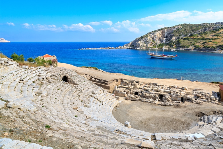The history of the finds in the Datça Peninsula dates back to 2000 BC. The first known indigenous people were the Carians, and the brightest period here was during the Dorians period. Dorians came to the region from Thrace to the south in 1000 BC, came to the region via Greece, and founded Knidos, the center of the Doric civilization, in Burgaz, 1.5 km northeast of today's Datça district center. Knidos, which later came under Lydian rule, also came under Persian rule after the Lydian State fell into the hands of the Persians in 546 BC. Knidos was moved to the tip of the peninsula, where the magnificent ruins are today, in the 4th century BC for commercial reasons. Strabo states that Knidos was founded along the coast and on the island in front of it. By filling the sea between the island and the land, two separate ports were obtained. The small port in the north was called "North Port" and was used for military purposes. The port in the south was used for trade purposes. Currently, the ruins of the breakwater at the mouth of the harbor and the tower in the North Harbor can be seen. Dorians and Romans built many temples in New Knidos. The city became famous for its Aphrodite statue. During the late Roman and early Byzantine periods, temples were replaced by churches and the city population reached 70,000. Knidos was a very important trade center as well as a center of culture and art. The Knidos Aphrodite in the Knidos Aphrodite Temple, made by Praxiteles, one of the most famous sculptors of the period, is a very important work of art. Artists always prioritized Aphrodite in religious festivals organized with the participation of Ionian cities. The famous astronomer, mathematician and philosopher Eudoxus, who discovered that the planets are round bodies that always move in the same orbit, the sculptor Praxiteles, Skopas, Bryaxis, who made the best-sculpted Naked Aphrodite Statue, and Sastratos, Knidos, the architect of the Lighthouse of Alexandria in Egypt, one of the seven wonders of the world. They lived in . Artifacts such as the base of the statue of Aphrodite, the theater with a capacity of 8000 people, the sundial and the Temple of Demeter are among the important ruins of the ancient city of Knidos. The statue of Aphrodite, which was very famous in ancient times and people came from far away to see it, has not been found until today.