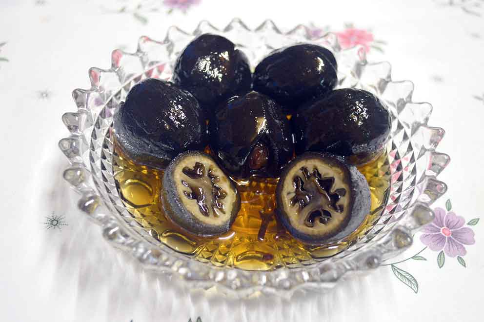 Green walnuts, which are collected and peeled from walnut trees, are kept in water in a large basin in a cool environment for 6-7 days, provided that the water is changed twice a day. After the waiting period is completed, lime is added to the water of the walnuts and kept in lime water for 8-10 hours. The walnuts extracted from the lime water are rinsed by washing with plenty of water. Then the walnuts are boiled by changing the water 3 times. Boiled walnuts are pierced with the help of skewers and the almonds that have been boiled and peeled beforehand are placed in the walnut. The walnuts, which are kept for two hours in plenty of lemon water, are taken into the pot. For every 100 walnuts, 2.5 kilos of sugar and 2 glasses of water are added. Some cloves are added. First, the sugar must melt on low heat. Until the sugar dissolves, the walnuts also release water. The pot taken from the fire is left for 5-6 hours. Then the boiling process is repeated one or two times until the consistency is reached.